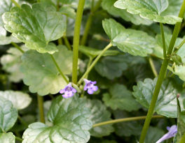 ![]() Ground ivy's growth habit is, well, ivy-like. The main stem creeps along the ground, sending out small, but strong, fibrous roots at each leaf axil that touches the ground. The main stem is square, and the long leafstalks are semi-circular, following the same pattern as the paired, opposite leaves. The leaves are rounded, with scalloped edges, and about ½" to 1 ½" across. They're generally green, but they often develop a purplish or reddish tinge. The leaves have a minty scent, which I find pleasant in small doses, but sometimes rather strong when mowing the lawn. Ground ivy can be invasive, and is often considered a weed, though it's also sometimes used as a tough, shade-tolerant ground cover. In the early spring, the plant produces upright branches (to 8") which usually bear three to seven, ½" to ¾" purple flowers. The flowers are bilaterally symmetrical (right and left mirror each other, but top and bottom don't) with five united petals and four stamens. The petals form a tube which splits into a small upper lip, and a larger, three lobed, lower lip. These flowers are worth a closer look, especially if you happen to have a magnifying glass. I recall picking ground ivy leaves when I was seven or so, and drying them for tea, though I haven't the faintest idea who told me I could. |